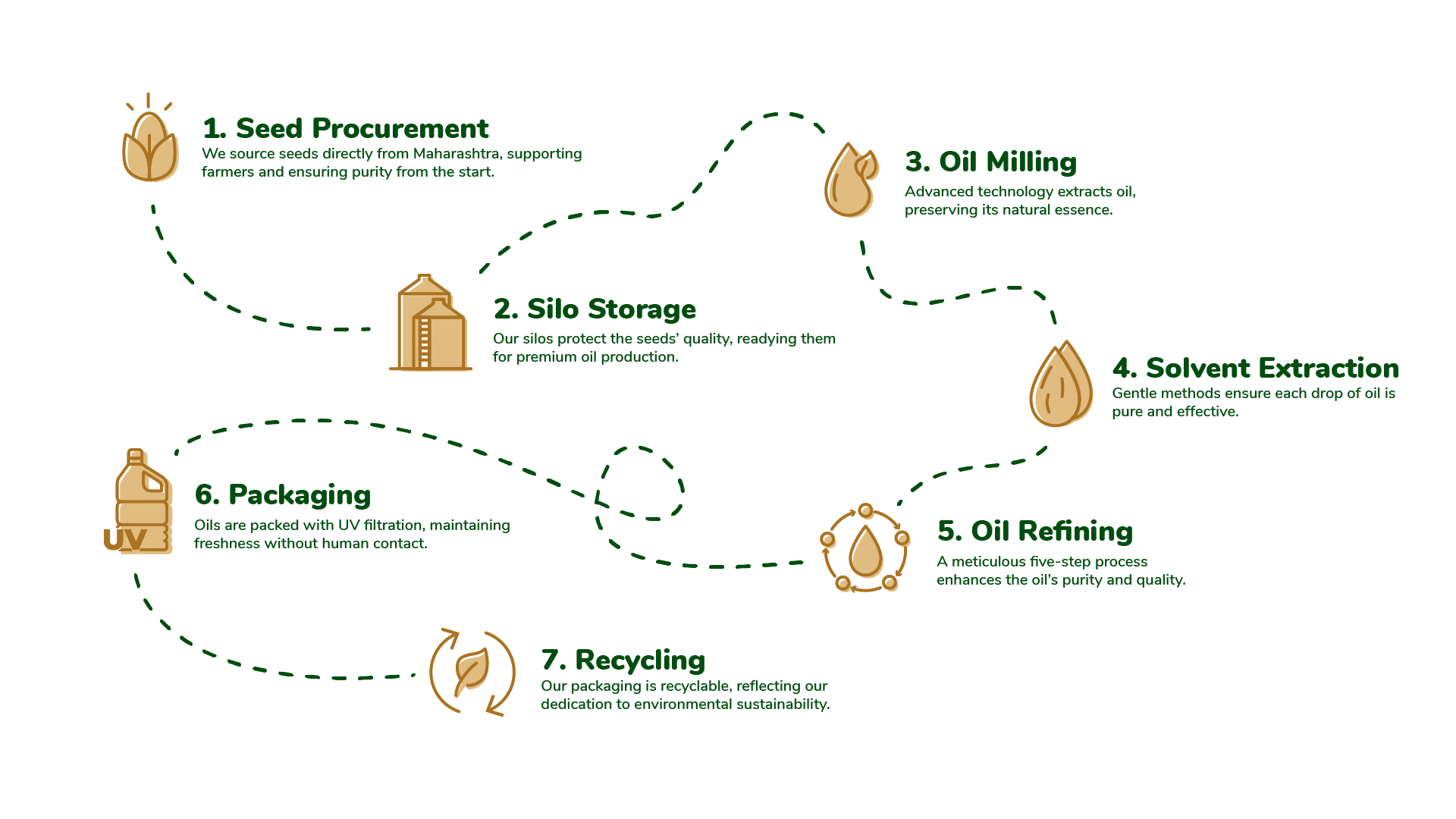 Our Ecopure Process starts in the lush landscapes where we partner with skilled farmers to source the finest seeds. This collaboration ensures every batch of Goodness oil begins with the purest, quality-assured ingredients. Our advanced extraction and refining techniques meticulously preserve the natural essence and nutritional integrity of the oil. By integrating state-of-the-art technology and sustainable practices, we maintain an ecological balance, delivering oils that are not only superior in quality but also embody the pristine purity of nature.